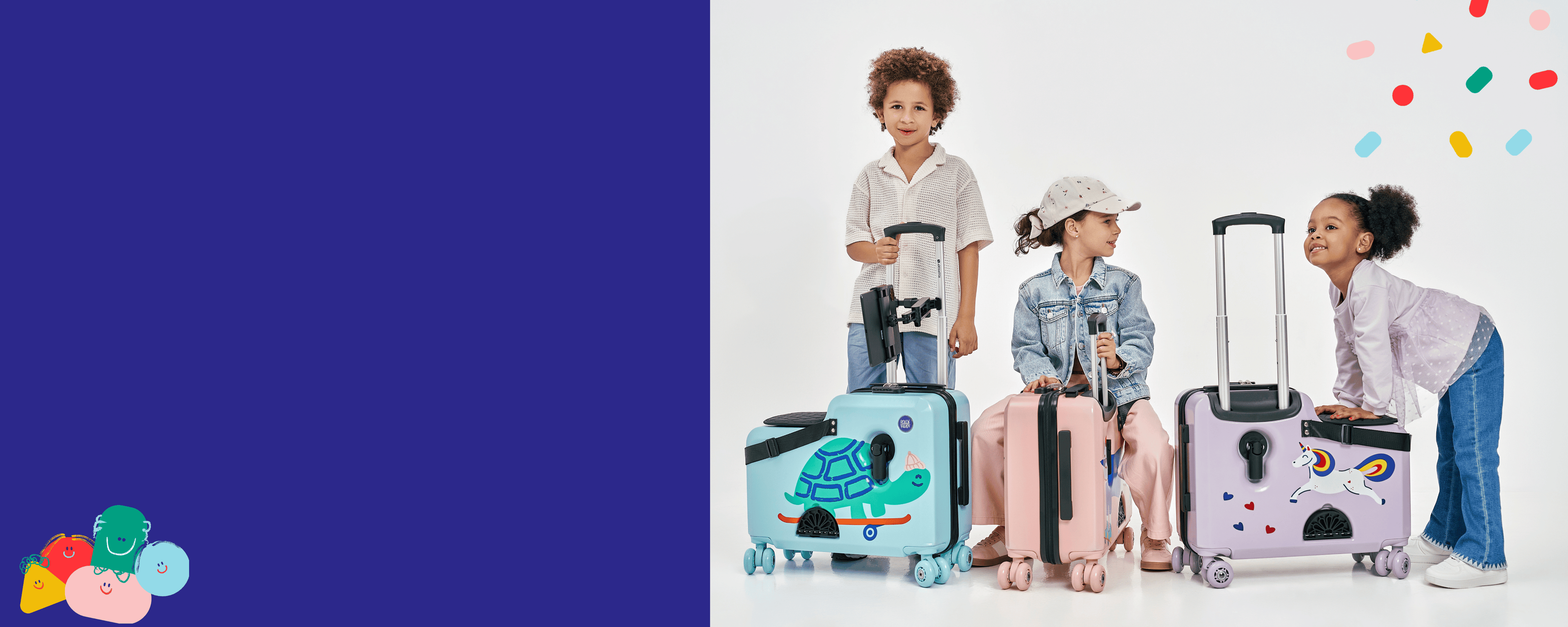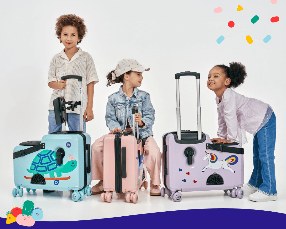 Our uniquely designed suitcases let kids ride on them, so they can stay entertained and engaged while their parents are busy packing and checking in or just simply shopping.